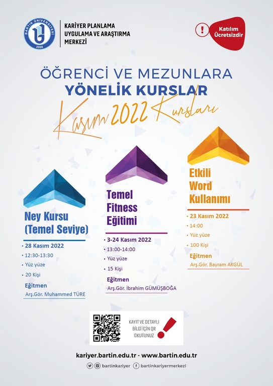 Üniversitemiz öğrenci ve mezunlarının kariyer gelişimlerine katkı amacıyla açılan kurslar için başvuru formuna, ekte yer alan görselin üzerindeki karekodu okutarak veya aşağıda yer alan link bağlantısı üzerinden ulaşabilirsiniz.