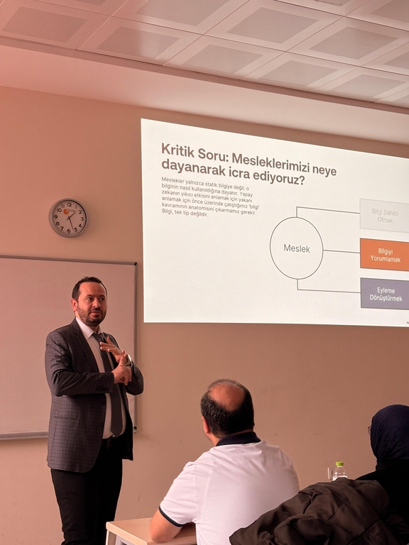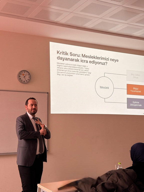 Sunumda, “Yapay zekâ mesleklerimizi elimizden alacak mı?” sorusundan hareketle, asıl önemli meselenin mesleklerin tamamen ortadan kalkmasından çok, mesleklerin icra edilme biçiminin değişmesi olduğu ifade edildi. Özellikle kavramsal ve prosedürel işlerde yapay zekânın güçlü bir destek sunduğu; buna karşılık stratejik düşünme, doğru soruyu sorma, bağlam kurma ve karar verme gibi insan merkezli becerilerin önemini koruduğu aktarıldı.